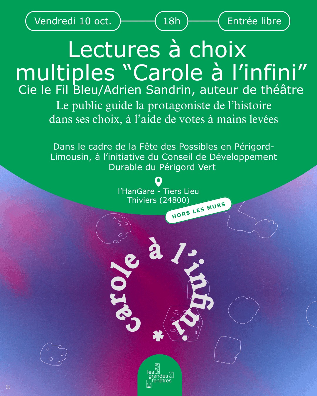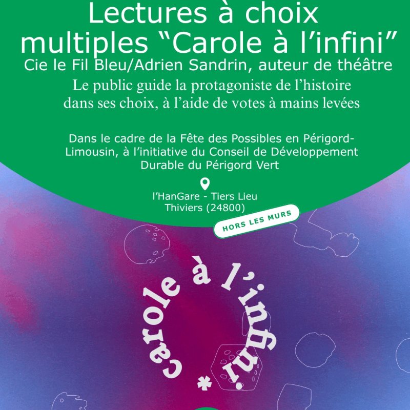 Le spectacle Carole à l'infini a bien grandi à cette occasion, notamment grâce aux merveilleux temps de lecture organisés par les Grandes Fenêtres, d'abord avec les Collégiens et Lycéens du Groupement Scolaire d'Excideuil, puis à l'HanGare de Thiviers, à l'occasion de la Fête des Possibles.